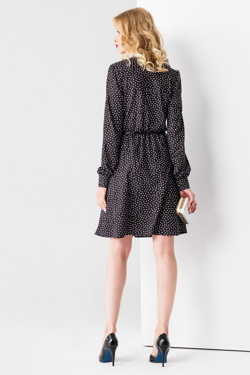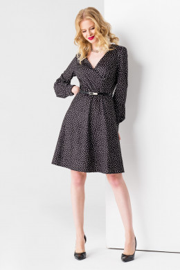 Стильное платье из трикотажного полотна с рисунком в мелкий горошек. Платье отрезное по талии. Лиф платья выполнен на запах, юбка платья расширена. Рукава длинные на широкой манжете. Платье дополнено тонким кожаным ремнем. Очень изящное платье как для повседневных дней, так и для любых светских мероприятий.