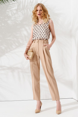 Зауженные женские брюки с высокой посадкой хорошо садятся по фигуре, маскируя лишние сантиметры в области живота. Легкие защипы в верхней части полотнищ переходят в стрелки, визуально удлиняющие ноги.