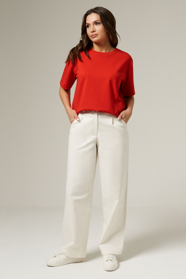 Женские брюки изготовлены из плотной эластичной ткани с гладкой, тактильно приятной поверхностью. Материал не сминается, не деформируется при активной носке.