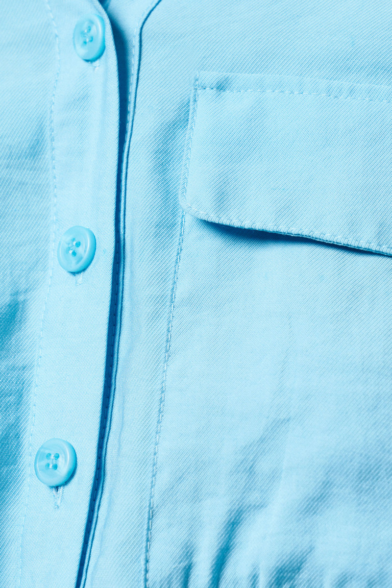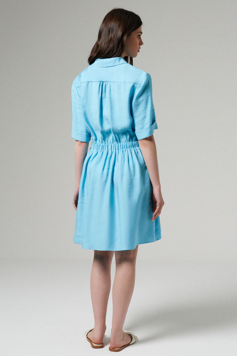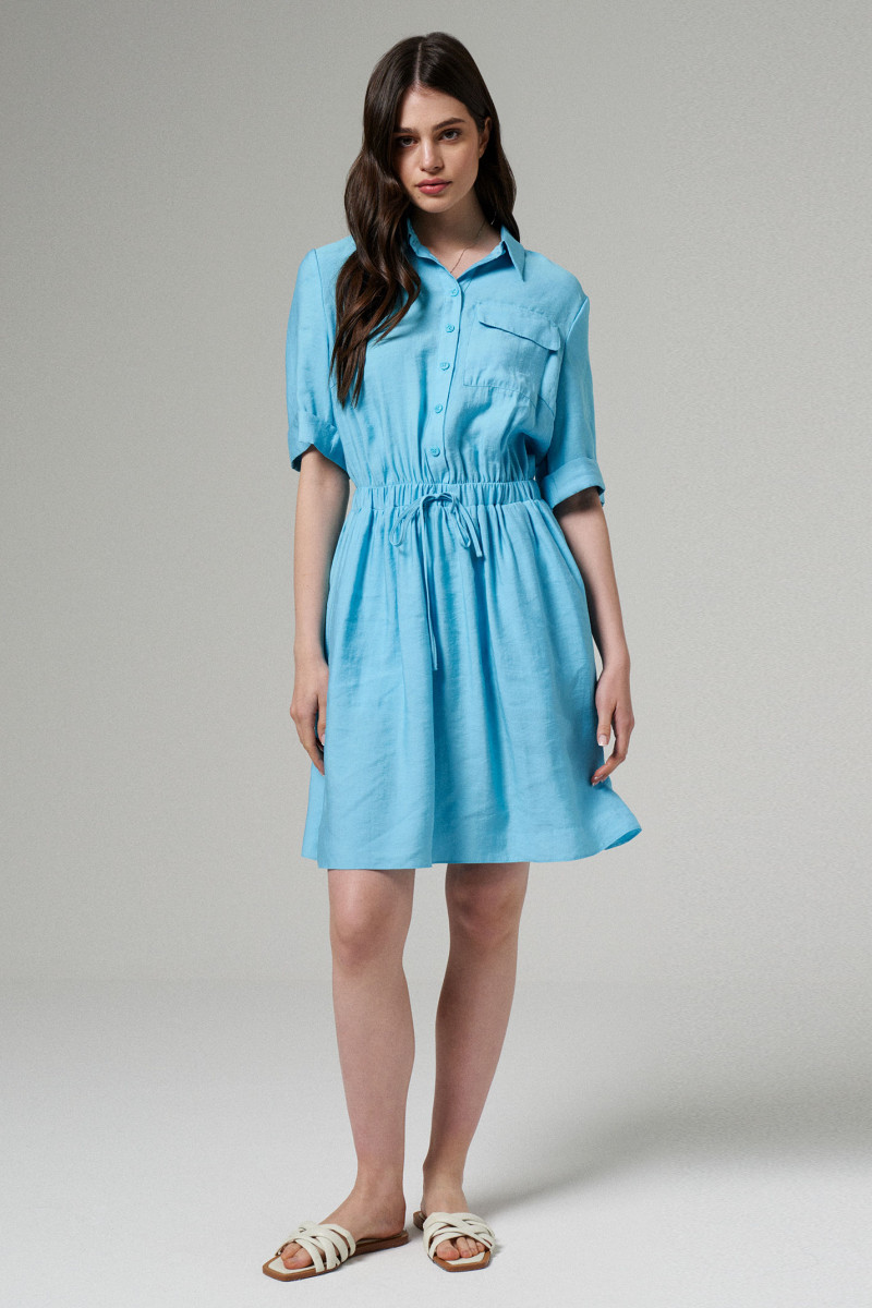 Платье женское на хлопковой подкладке для повседневной носки. Изделие полуприлегающего силуэта, отрезное по талии. По переду фронтальная застежка на пуговицы до талии, накладной карман с клапаном. Рукав короткий втачной оформлен притачной отложной манжетой. Воротник- стойка. По линии талии кулиса, в боковых швах прорезные карманы. Длина изделия до колена.