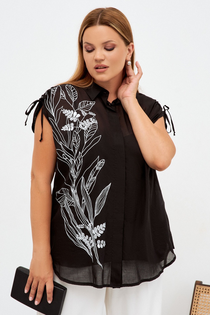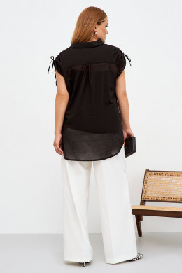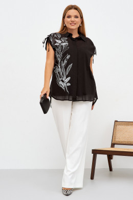 Чтобы дополнить свой гардероб универсальной вещью, обратите внимание на комплект женский, состоящий из однотонной хлопковой туники и прозрачной блузки из вискозы на пуговицах. Оригинальный дизайн и исполнение модели покорит ваше сердце. Спереди блузка женская праздничная украшена вышивкой контрастного белого цвета в цветочном стиле. Она ассиметрична и расположена по правой стороне. Блузка с короткими рукавами, оканчивающимися завязками, кокетливо оголяют руки. Модель отлично сочетается с брюками. Вы можете купить комплект из блузки и туники для деловой встречи или торжественного мероприятия.