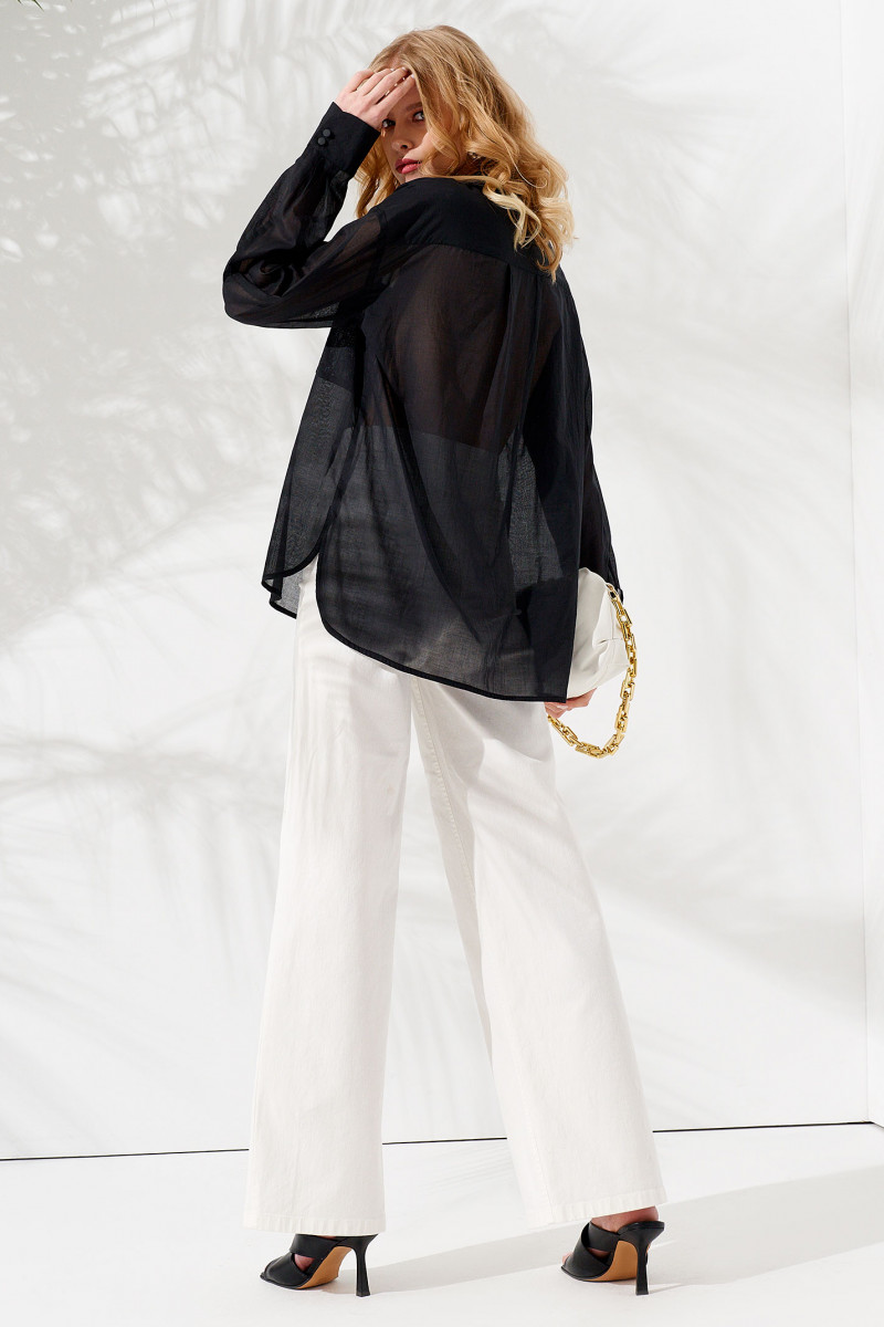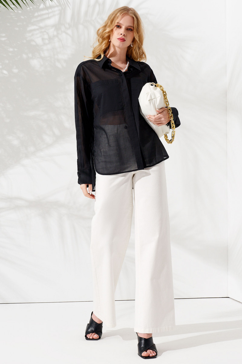 Стильная хлопковая блузка с длинным рукавом на пуговицах подарит вам комфорт и станет лучшим дополнением летнего образа. Тонкий материал свободно пропускает воздух. Ткань просвечивается, поэтому вы можете сочетать летнюю женскую рубашку с топами и майками. Блузка рубашка женская будет уместна на прогулке, в офисе, на встрече. Она одинаково подходит для делового и кэжуал стиля. Короткая женская блузка хорошо дополнит брюки с высокой посадкой или джинсы. Закругленный низ и разрезы по бокам придают модели кокетливые ноты. Вы можете купить классическую блузку-рубашку в нужном размере уже сегодня.