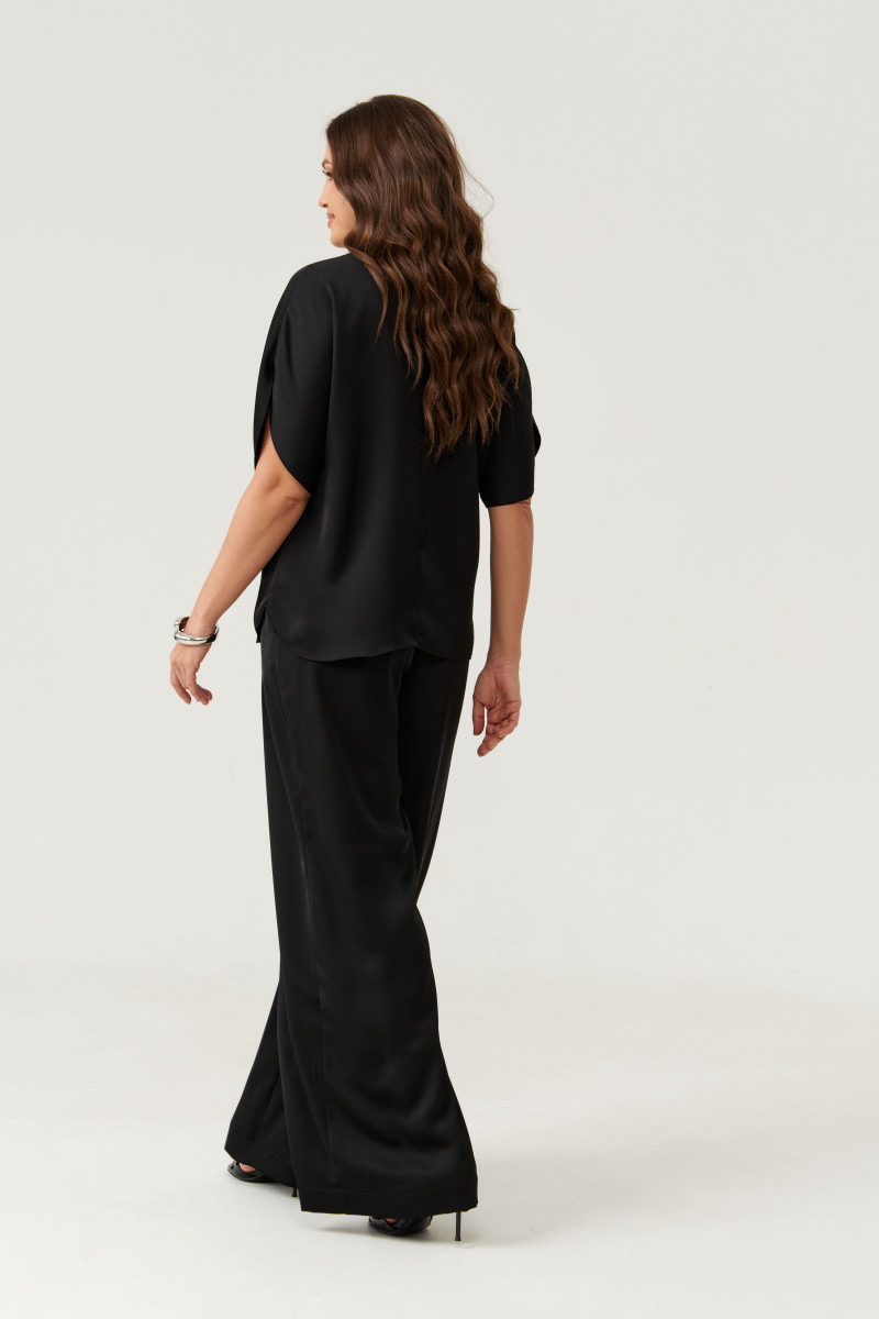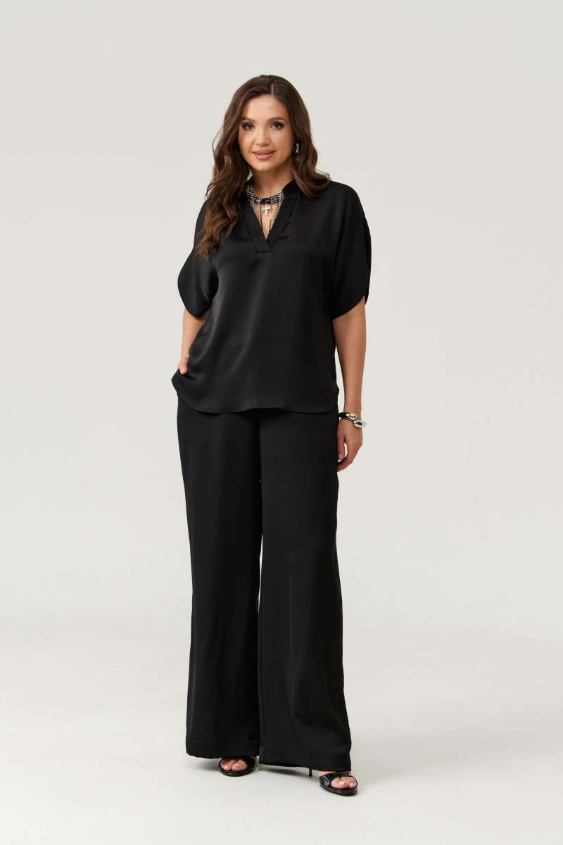 Элегантная женская блузка из атласной ткани, идеально подходящая для повседневной носки. Спинка блузки имеет средний шов, что подчеркивает силуэт и создает эффект легкости. Передняя часть блузки немного короче спинки, что создает современный и динамичный силуэт. Модель отличается V-образным вырезом горловины, который аккуратно обработан планкой и притачной стойкой, придавая образу утончённость и стиль. Рукава выполнены цельнокроеными, что обеспечивает свободу движений и комфорт в носке. Низ рукава оформлен фигурной линией, добавляющей изюминку в дизайн. Эта модель блузки классического чёрного цвета станет отличным дополнением к вашему гардеробу, легко сочетаясь с различными предметами одежды.