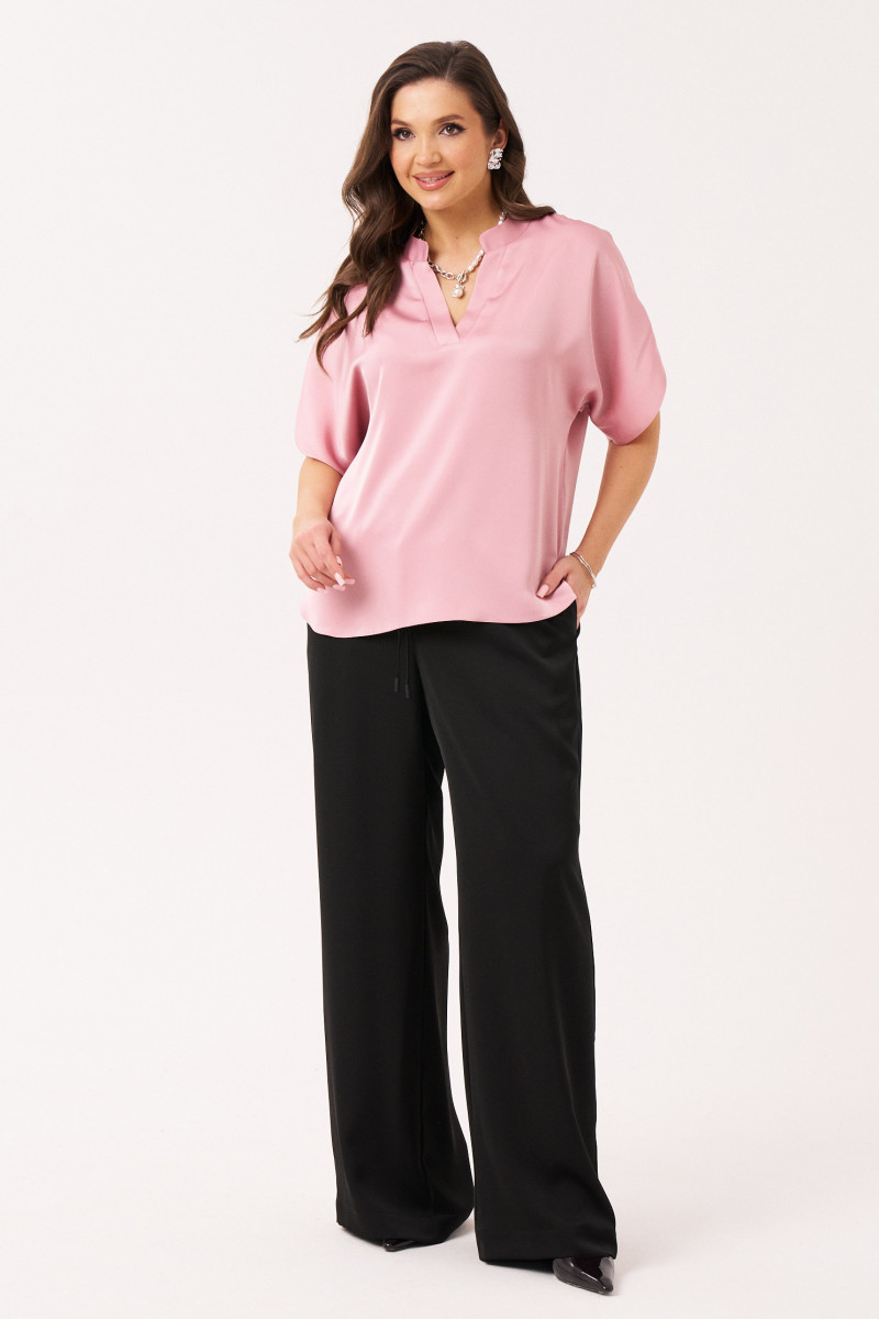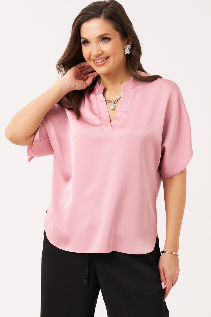 Элегантная женская блузка из атласной ткани, идеально подходящая для повседневной носки. Спинка блузки имеет средний шов, что подчеркивает силуэт и создает эффект легкости. Передняя часть блузки немного короче спинки, что создает современный и динамичный силуэт. Модель отличается V-образным вырезом горловины, который аккуратно обработан планкой и притачной стойкой, придавая образу утончённость и стиль. Рукава выполнены цельнокроеными, что обеспечивает свободу движений и комфорт в носке. Низ рукава оформлен фигурной линией, добавляющей изюминку в дизайн. Эта модель блузки розового оттенка станет отличным дополнением к вашему гардеробу, легко сочетаясь с различными предметами одежды.