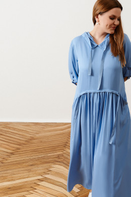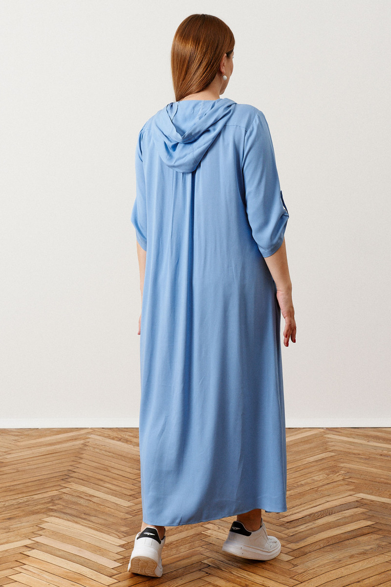 Платье оверсайз безупречно садится по фигуре. Свободный крой скрывает от взглядов окружающих все несовершенства силуэта. Капюшон с завязками, имитирующий отложной воротник, придает вещи необычный вид. Особенности покроя изделия: V-образный вырез горловины, рукава длиной немного ниже локтей, карманы по бокам, тонкий поясок, волнообразные складки в передней части.