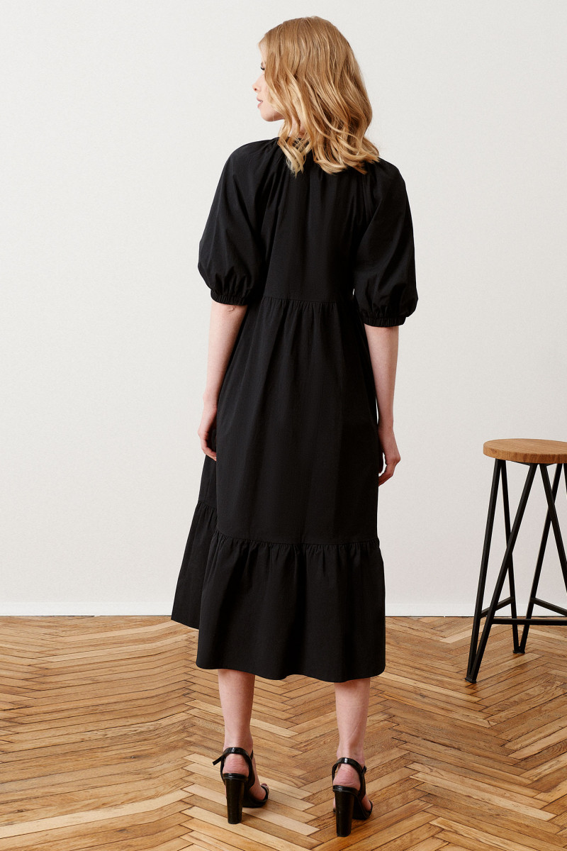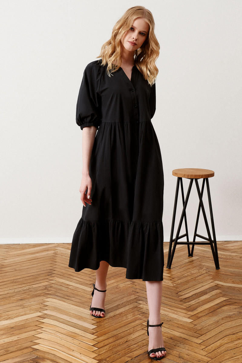 Хлопковое женское платье станет удачным выбором для теплого времени года. Оно отлично пропускает воздух, отводит влагу и дарит комфорт даже в солнечный летний день. По всей длине летнее женское платье дополнено пуговицами, рукава-фонарики оканчиваются резинкой. Свободный А-силуэт делает платье oversize подходящим вариантом для беременных девушек. Вы можете купить длинное платье для повседневной носки. Оно будет сочетаться с балетками, босоножками на каблуке, сандалиями.