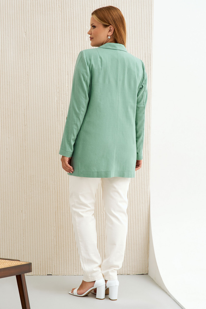 Удлиненный пиджак женский идеально дополнит повседневный кэжуал или деловой стиль. Двубортный отложной воротник формирует красивую линию декольте. Впереди трикотажный жакет женский застегивается на одну пуговицу. Его можно надеть поверх блузки, футболки, майки, сочетать с брюками, джинсами, легинсами, бриджами. Жакет с рукавом ¾ подарят вам комфорт в пасмурный день или летний вечер. Будет актуален на торжественном мероприятии и обычной прогулке. Вы можете купить женский летний жакет в размерах 50-58.