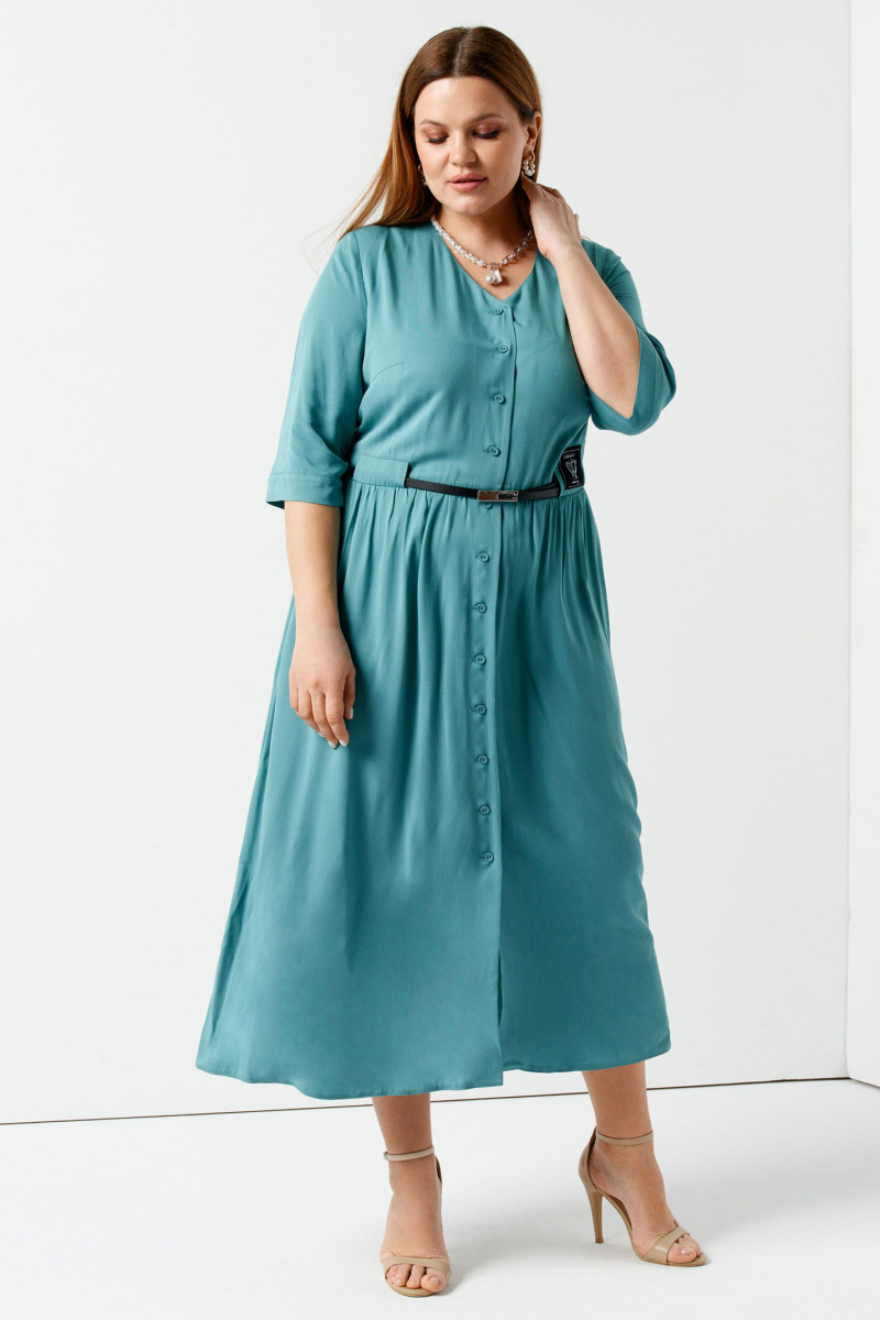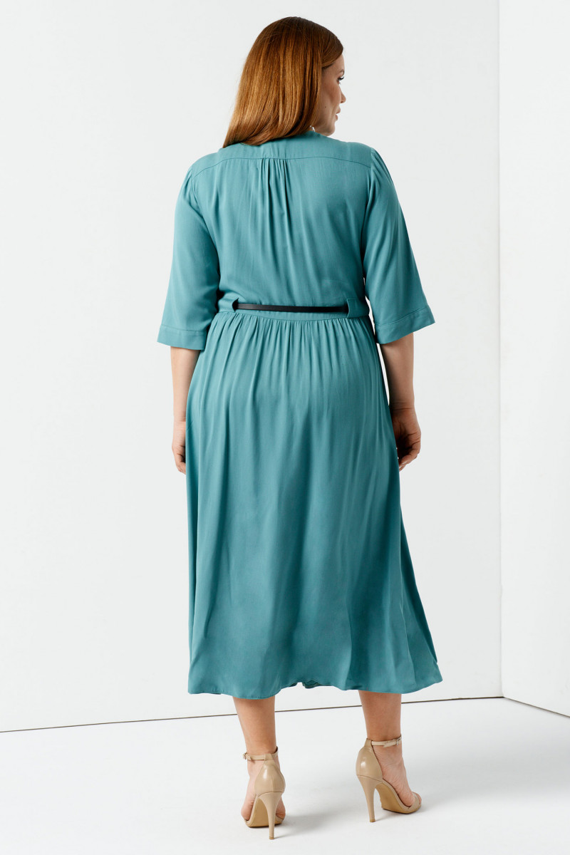 Летнее платье свободного кроя А - силуэта из вискозы от белорусского производителя Panda. Размеры от 48 до 56. Небесно-голубой цвет, длина до середины икры, рукав ¾, V-образный вырез, планка с мелкими пуговицами по всей длине. Изящный тонкий ремешок подчеркнет талию. Фасон подойдет женщинам с любым типом фигуры, в том числе носящим одежду больших размеров и беременным. Можно носить как на работу, так и на прогулку или пляж.