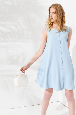 Платье летнее женское подарит вам свободу и комфорт в повседневной жизни. Скроено оно как платье рубашка, спереди по всей длине расположен ряд пуговиц. Свободный крой делает платье идеальным выбором для беременных. Вырез горловины круглый, без воротника, что подчеркивает изящные линии шеи. Украшает платье длиной до колена нежный голубой цвет. Вы можете купить платье на пуговицах в размерах 42-48 по выгодной цене.