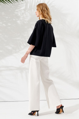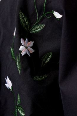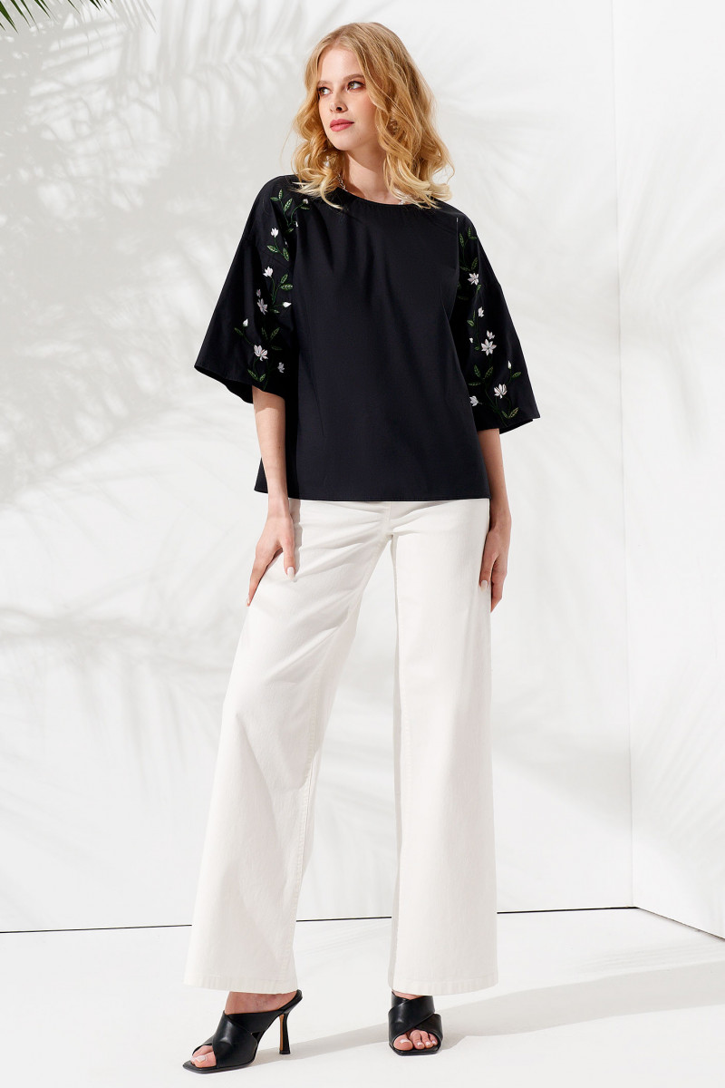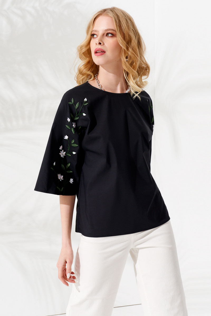 Блузка с принтом может стать частью делового, повседневного, торжественного или вечернего образа. Стильная модель с вышитыми флористическими узорами выглядит нарядно и празднично. Она составит гармоничные сочетания с брюками классического кроя и джинсами, юбкой-карандаш. Футболка свободного кроя отлично скрывает несовершенства силуэта. Округлый, продолговатый вырез горловины подчеркивает женственность. Широкий рукав длиной ¾ делает акцент на изящности линий рук и кистей. Блузка из хлопка обеспечивает комфорт в жаркие дни. Приятная на ощупь ткань не электризуется, пропускает воздух к телу. Вы можете купить роскошную блузку с вышивкой по выгодной цене в стандартной линейке размеров 42-50.