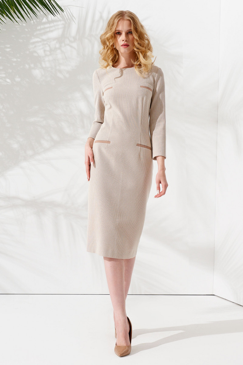 Облегающее платье, изготовленное в размерах 40-50 из нежной хлопковой ткани, станет эффектным акцентом вашего делового, вечернего, повседневного образа. Летнее платье приталенного фасона красиво подчеркивает стройность фигуры. Идеальную посадку обеспечивают фигурные швы по переду и нагрудные вытачки. Длина миди отлично смотрится в сочетании с каблуками. Классическое платье с втачными рукавами ¾ дополнено парными прорезными карманами с рамкой контрастного цвета на груди и ниже линии талии. Вырез горловины – круглый. Вы можете купить платье из хлопка высокого качества по выгодной цене и создавать множество элегантных образов для любого случая.