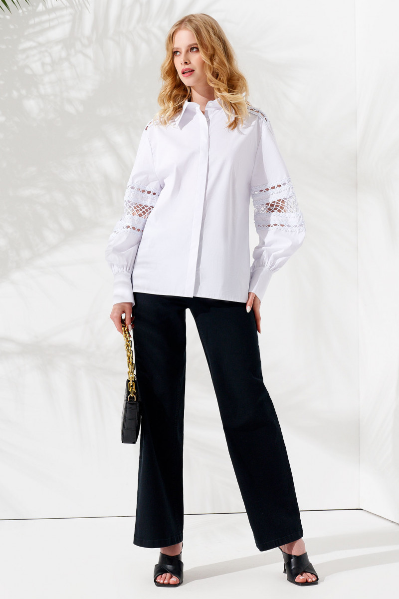 Нарядная блуза – важная деталь в вашем гардеробе. Блуза рубашка подходит для создания деловых и повседневных луков. Она изысканно выглядит, благодаря кружевным вставкам на длинных рукавах и плечах. Женская блуза на пуговицах скроена в свободном фасоне, с рубашечным воротником и скрытой планкой-застежкой. Блуза женская из хлопковой ткани позволяет коже дышать, хорошо держит форму, не мнется.