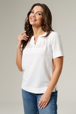 Блуза женская с коротким рукавом – незаменимая одежда для жарких дней. Летняя блуза из натурального хлопкового полотна поможет вам создавать интересные повседневные образы. Модель скроена в чуть приталенном фасоне, который подчеркнет достоинства вашей фигуры. Белая блуза украшена изящной вышивкой по передней полочке. Нарядная женская блузка привлекает внимание оригинальной формой выреза горловины.