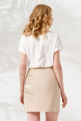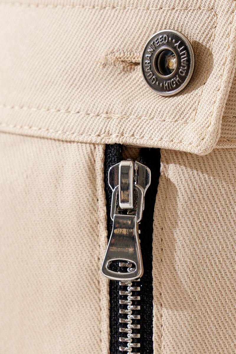 Юбка женская короткая на талии имеет притачной пояс с пуговицей. Изделие застегивается на металлическую молнию с большими зубцами, которая вместе с крупными накладными карманами также выполняет роль декоративного элемента.