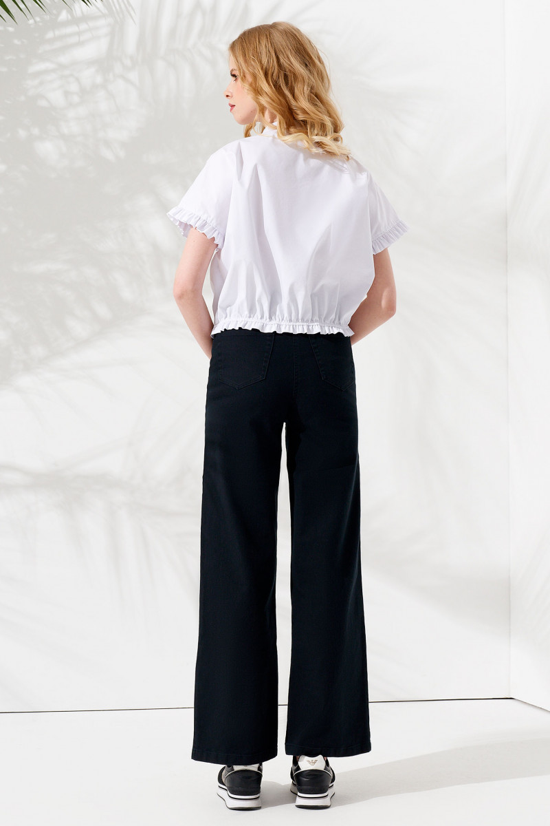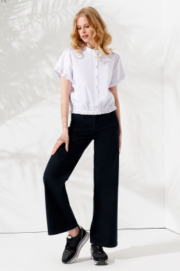 Короткая женская блузка без воротника – стильное дополнение делового образа. Она универсальна, ее можно носить под брюки и юбку. Спереди блузка белая женская украшена рядом пуговиц. Внизу элегантная женская блузка оканчивается резинкой. Короткий рукав с оборкой напоминает легкое крылышко бабочки. Благодаря натуральному материалу изготовления, хлопковая женская блузка дарит комфортные отношения в жаркую погоду. Ее вы сможете носить в офис, на учебу, работу, торжественное или деловое мероприятие. Вы можете купить летнюю женскую блузку в стандартных размерах – 42-48.