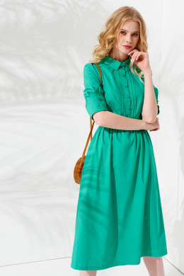 Дополнить деловой летний гардероб вам поможет офисное платье из натурального хлопка. Прямой крой, укороченный рукав, отложной воротник и ряд пуговиц впереди – характерные особенности данной модели. Платье с рукавом ¾ также дополнено тонким кожаным поясом контрастного цвета. Вы сможете носить яркое летнее платье под обувь на каблуке и танкетке. В таком наряде уместно отправиться на семинар, деловой обед и другое мероприятие. Вы можете купить платье длины миди в размерах 42-46.