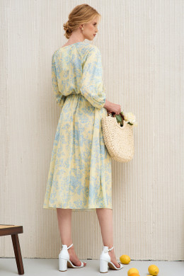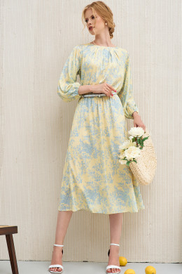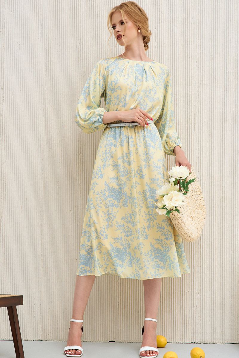 Легко и воздушное летнее платье миди пополнит ваш гардероб и поможет создать изысканный образ. Платье выполнено из вискозы с круглым выкатом горловины имеет мелкие защиты, которые как лучи солнца расходятся по зоне декольте. Ткань струится и ненавязчиво подчеркивает все достоинства женской фигуры. Платье длины миди с рукавами 3 четверти дополнено тонким поясом, формирующим линию талии. Вы можете купить женское платье стандартных и больших размеров для свидания, торжественных мероприятий, повседневной носки. Нежно-голубая расцветка превосходно сочетается с приглушенным растительным принтом