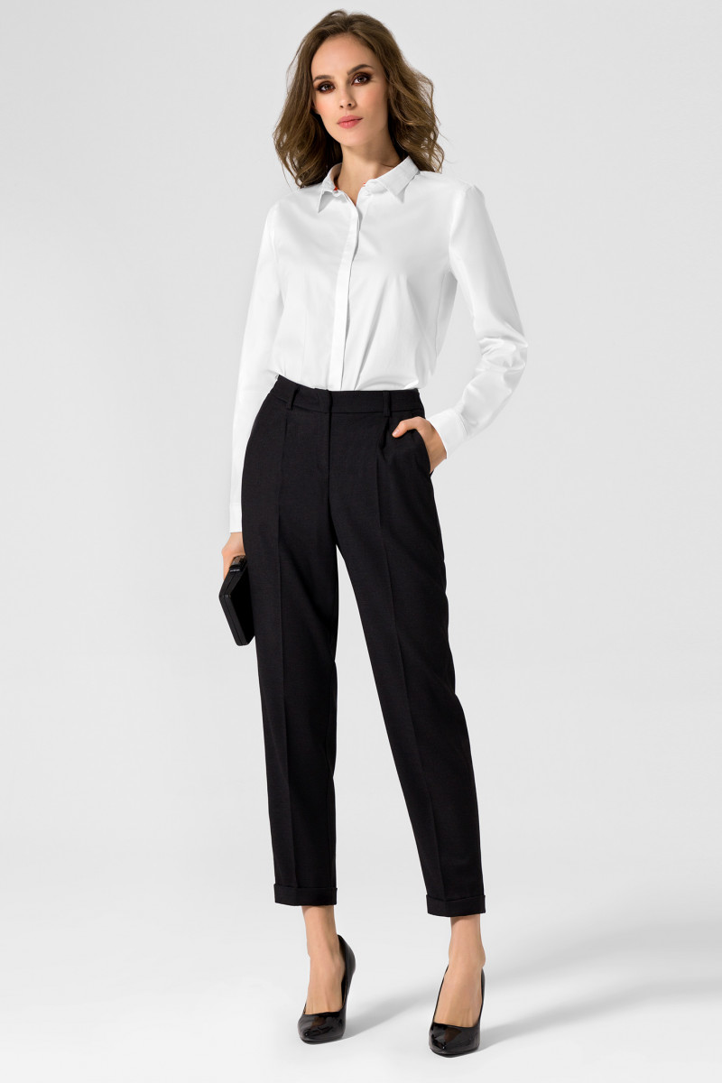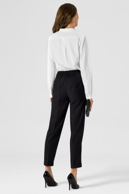 Модные брюки из костюмной ткани. Брюки зауженные к низу с манжетами. По переду по бокам имеются карманы. На задних частях брюк имитация карманов в рамку. По поясу сзади резинка. По переду имеются от пояса небольшие складочки. Застежка по переду на тесьму-молнию и потайные крючки по поясу.