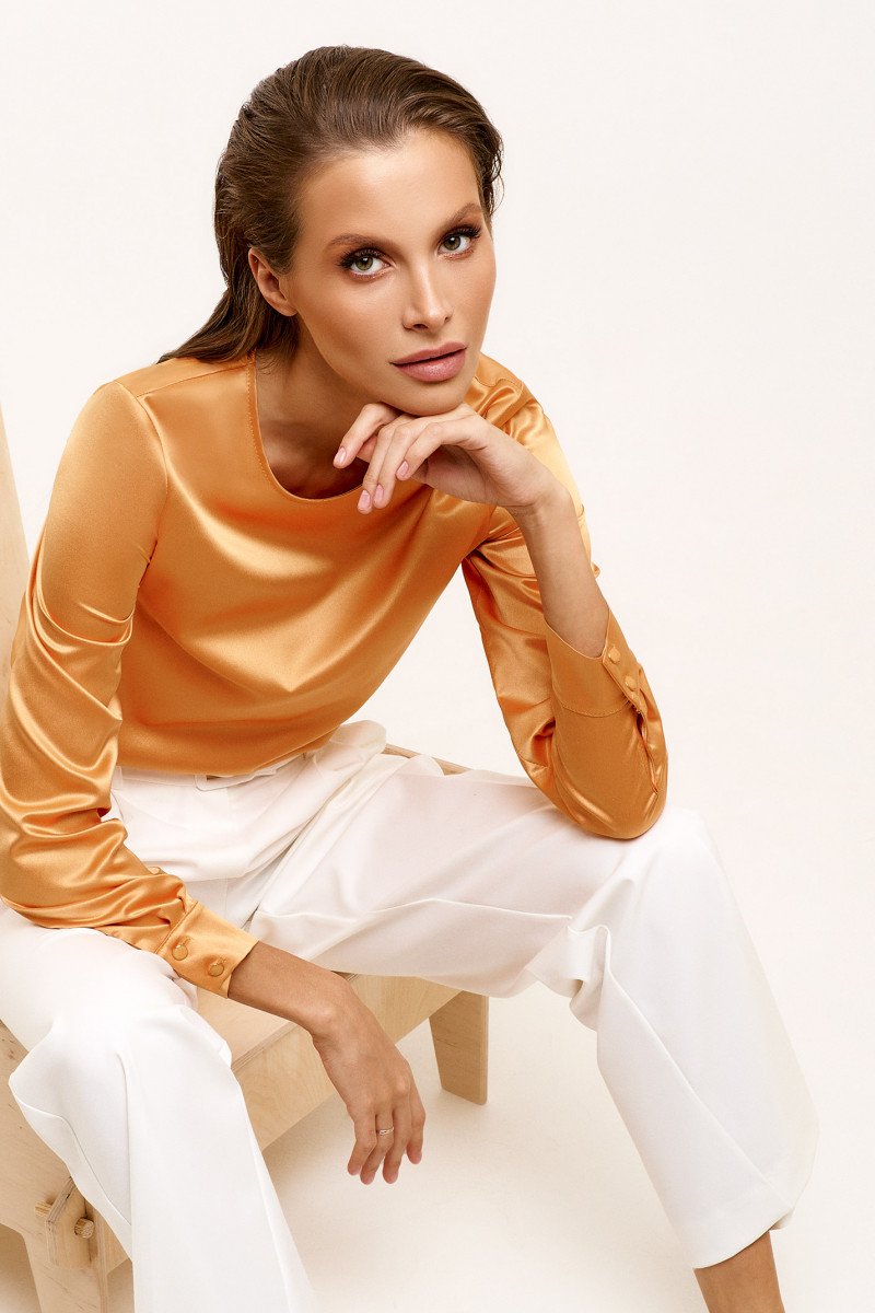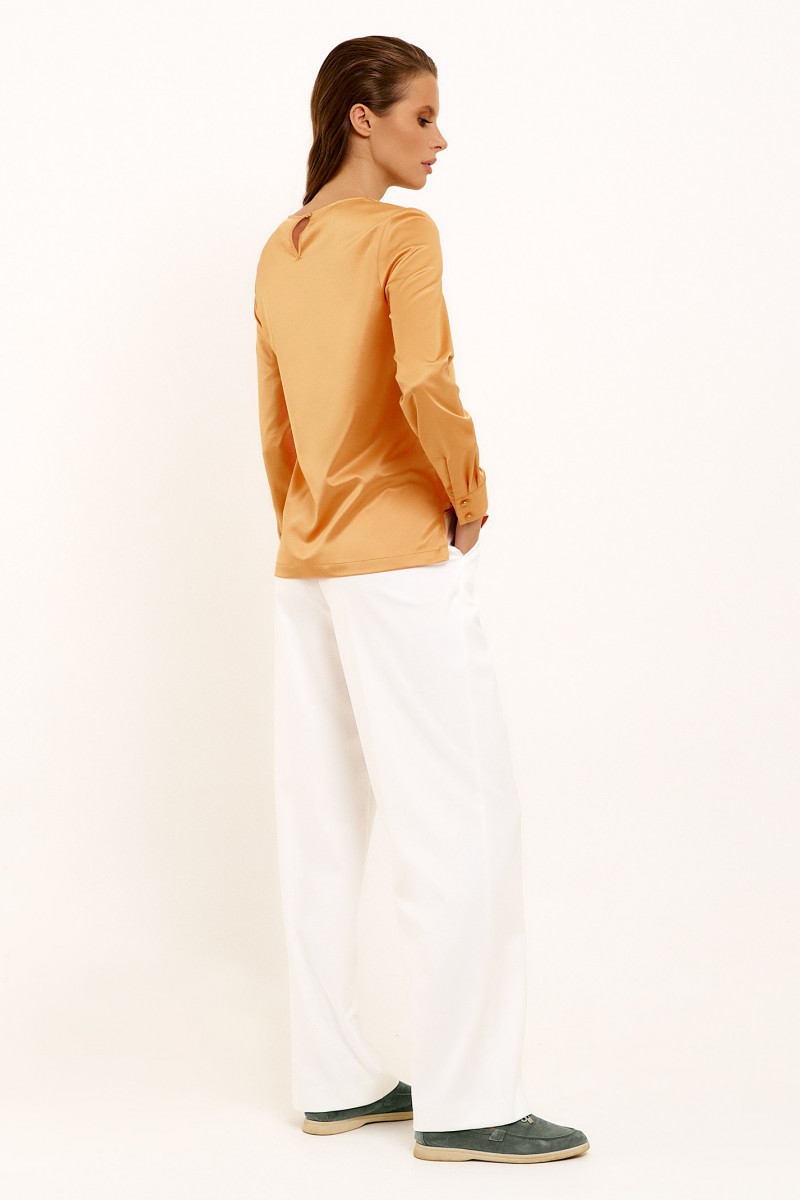 Лаконичная блузка из струящийся ткани с небольшим блеском. Блузка прямого силуэта с длинными рукавами с круглым вырезом горловины. Рукава с притачными по низу манжетами с декоративными пуговицами. Застежка по спинки на навесную петлю и пуговицу. По бокам разрезы. Отличный базовый вариант блузки в офис на каждый день.