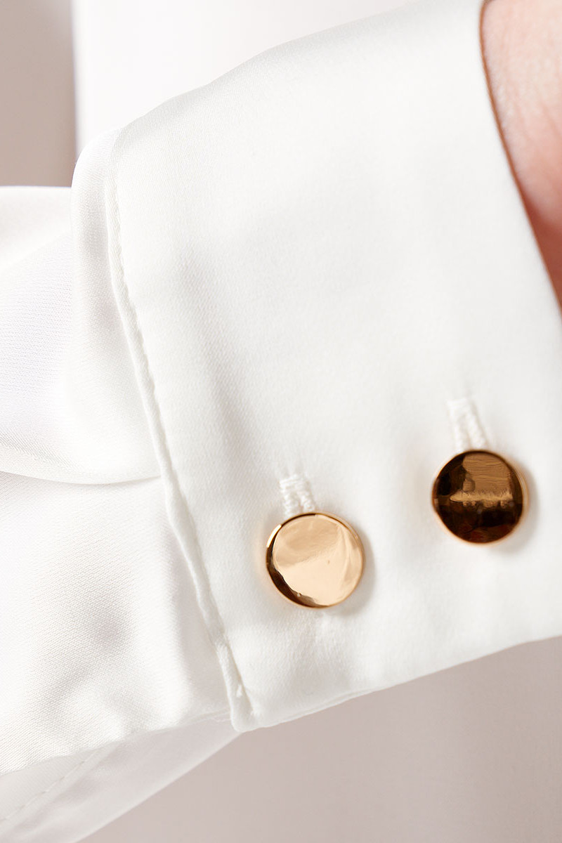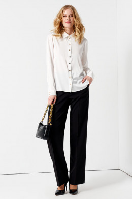 Блуза-рубашка скроена в прямом силуэте, не облегающем фигуру. Единственный элемент декора - блестящие пуговицы по центральной планке и на широких притачных манжетах. Изделие дополнено отложным воротником рубашечного типа.