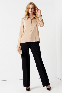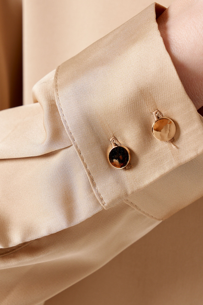 Блуза-рубашка скроена в прямом силуэте, не облегающем фигуру. Единственный элемент декора - блестящие пуговицы по центральной планке и на широких притачных манжетах. Изделие дополнено отложным воротником рубашечного типа.