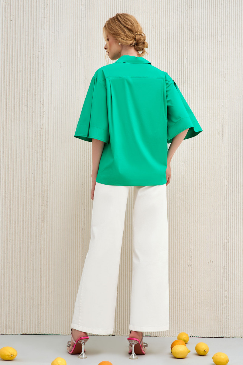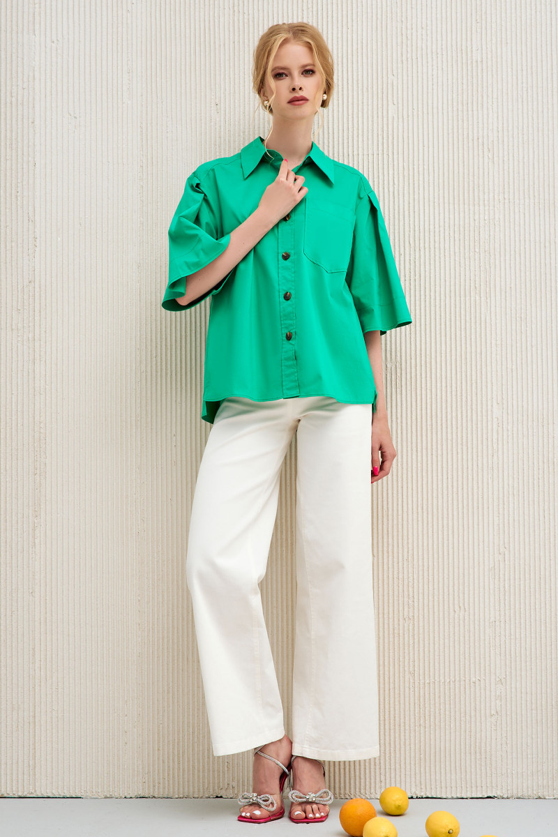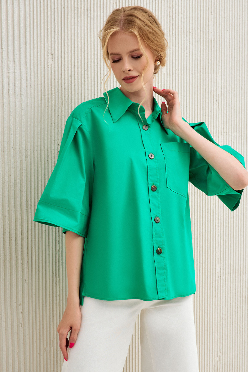 Блузка-рубашка создана в прямом силуэте, который выгодно стройнит фигуру, маскируя ее недостатки в области плеч, груди, живота. Рукав длиной до локтя – объемный, благодаря складкам по окату. Линия плеч – приспущенная. Летняя блуза застегивается на крупные пуговицы контрастного тона по центральной планке. Белая рубашка дополнена отложным воротником и нагрудным накладным карманом на левой полочке.