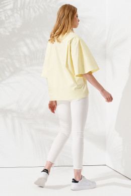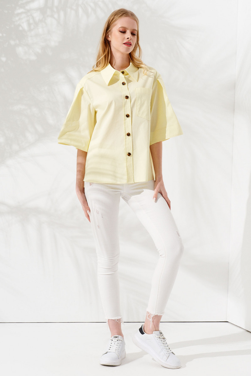 Блузка-рубашка создана в прямом силуэте, который выгодно стройнит фигуру, маскируя ее недостатки в области плеч, груди, живота. Рукав длиной до локтя – объемный, благодаря складкам по окату. Линия плеч – приспущенная. Летняя блуза застегивается на крупные пуговицы контрастного тона по центральной планке. Белая рубашка дополнена отложным воротником и нагрудным накладным карманом на левой полочке.