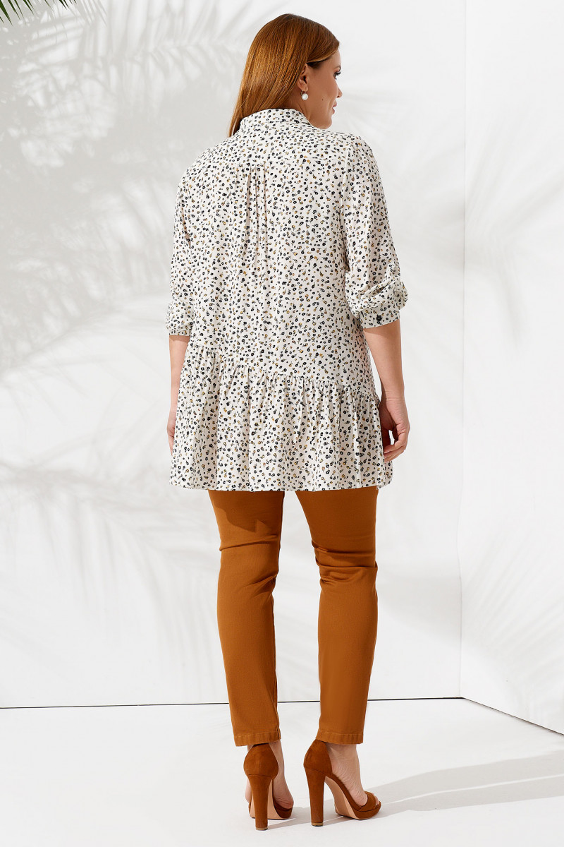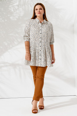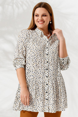 Нарядная женская блузка подойдет для пополнения летнего гардероба. Она подойдет для повседневной носки и поможет создать торжественный образ. Блузка-рубашка на пуговицах с отложным воротником и длинным рукавом хорошо сочетается с брюками и джинсами. Трикотажная блузка тонкая и мягкая, хорошо садится по фигуре, дарит комфорт в жаркую погоду. Она свободная, хорошо пропускает воздух, отсутствует парниковый эффект. Вы можете заказать блузку большого размера от 50 до 58 в приятной молочной расцветке с мелким принтом.