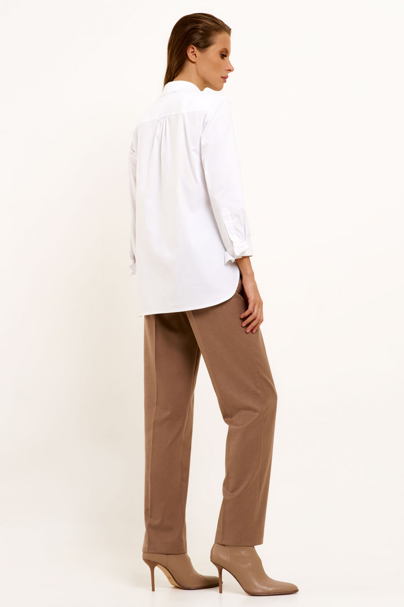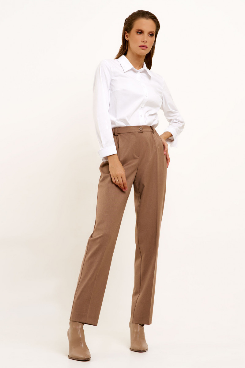Брюки женские из поливискозной ткани для повседневной носки. Изделие прямого силуэта. Брюки на пооясе, застёгивающийся на петлю-пуговицу и молнию. По поясу и меются шлёвки. По задней половинке брюк декоративная листочка. Длина изделия классическая.