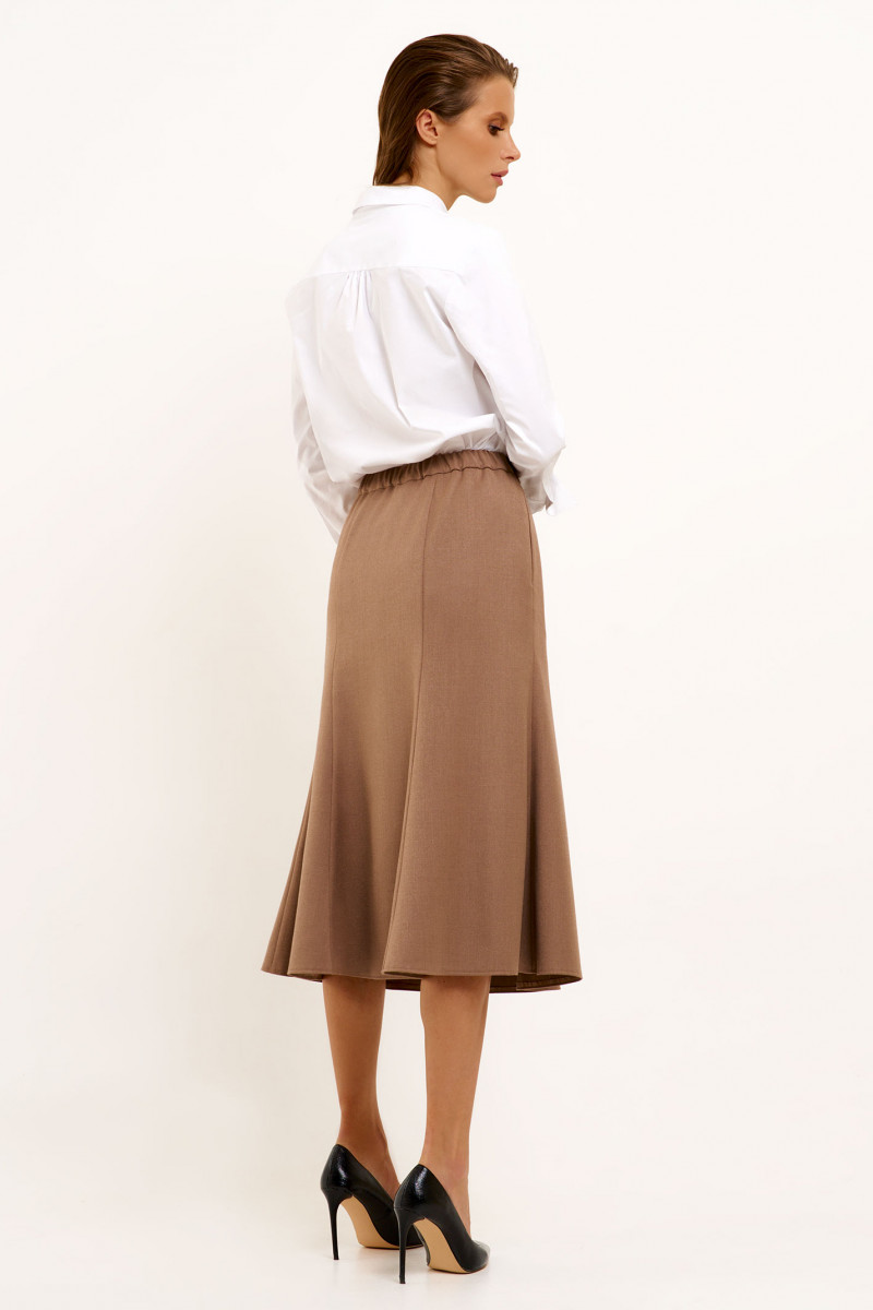 Юбка из поливискозной ткани для повседневной носки. Юбка длиной до середины голени, расклешающаяся к низу. Пояс юбки на резинке.Застежка на потайную молнию в боковом шве. Юбка на подкладке.