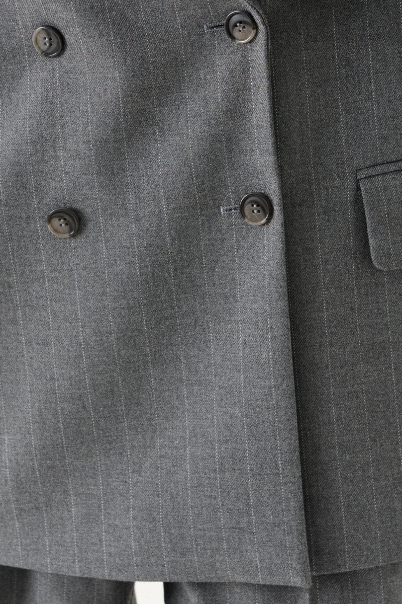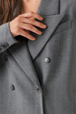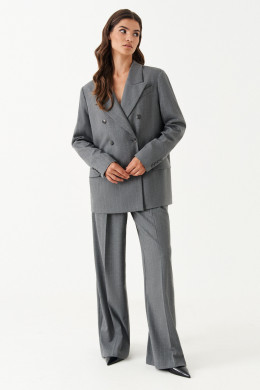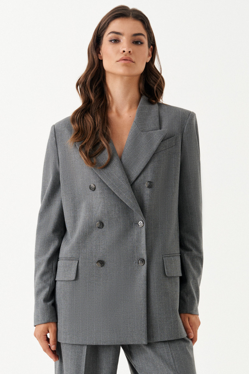 Жакет женский из смесовой ткани для повседневной носки на подкладке. Жакет полуприлегающего силуэта. Жакет двубортный, застежка на две обметанные петли и две пуговицы. Перед имеет два вертикальных рельефа, идущих от проймы до низа изделия, а также на переде располагается нагрудный карман с листочкой. По переду имеется карман с клапаном и двумя обтачками. Спинка со средним швом и с двумя рельефами, идущими от проймы до линии низа изделия. Горловина обработана пиджачным воротником. Рукава двухшовные с шлицей по низу рукава, на шлице имеются четыре пуговицы. Данное изделие станет отличным дополнением к любому гардеробу. И обязательно осчастливит его обладательницу своим прекрасным фасоном. Жакет имеет стильные вставки воротника и клапана из материала в линейку.