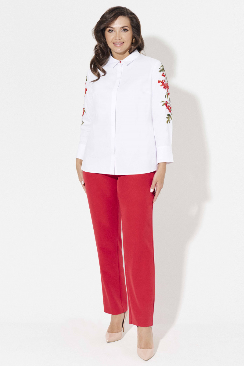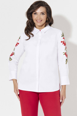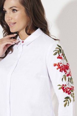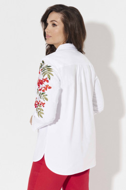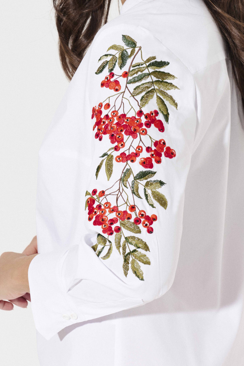 Блузка с вышивкой придаст вашему образу женственность и нежность. Даже в каждодневной суете в ней вы будете ощущать себя элегантной и романтичной натурой. Нарядная блузка подойдет даже под деловой образ со строгими классическими брюками или прямой юбкой. Наденьте ее с любимыми джинсами - и получите эффектный повседневный аутфит. Блузка полуприлегающего кроя визуально стройнит фигуру. Данная блузка украшена гроздьями рябины, вышитыми на длинных рукавах с манжетами. Декор не кажется навязчивым, а придает модели утонченность.Низ изделия - асимметричный, скругленный, с разрезами в боковых швах. Застежка скрыта в потайной центральной планке. Рубашечный воротник украшает пуговица красного цвета. Блузка с вышивкой женская изготовлена из хлопковой ткани с мягкой, гладкой поверхностью. Материал не сминается, не парит, за ним легко ухаживать - стирать и гладить.Вы можете купить рубашку с вышивкой женскую для своего базового осенне-весеннего гардероба.