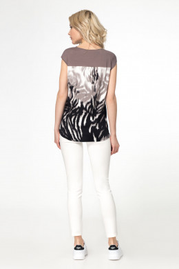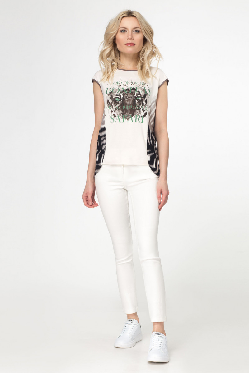 Джемпер. Из трикотажа. Прямой силуэт. Без воротника, с овальным вырезом горловины. Без рукава, со спущенной линией плеча. Боковые швы смещены на перед. По спинке кокетка,Горловина и проймы окантованы. Спереди нанесен принт.
