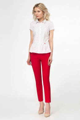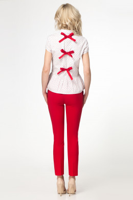 Стильная блузка из хлопковой ткани с мелким рисунком в горошек. Блузка дополнена оригинальными бантами по спинки. Блузка полуприлегающего силуэта, отрезная по талии. Нижняя часть блузки с небольшой сборкой по талии. Блузка с короткими рукавами, с отрезной планкой на петли и пуговицы. Отличный вариант как для офиса, так и для отдыха.