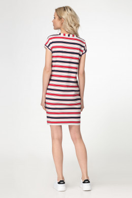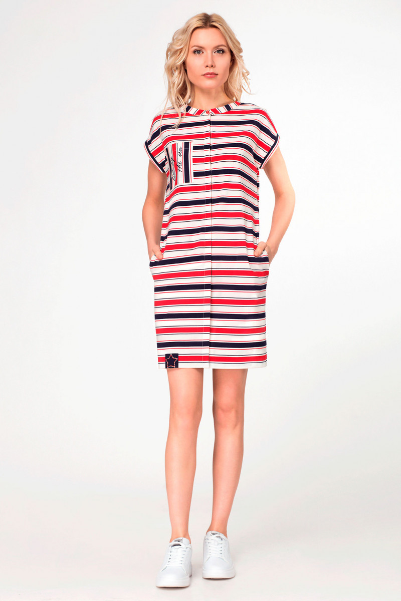 Стильное летнее платье из вискозной ткани с принтом в полоску, Платье полуприлегающего силуэта, с центральной потайной застежкой, с круглым вырезом горловины, со спушиной линией плеча, в боковых швах расположены карманы, на детале переда сделан акцент на карман с декором "шрифтовая печать" и декоративная нашивка по линии низа. Хороший вариант как для будней, так и для летнего отдыха.