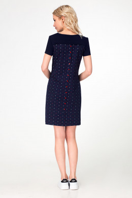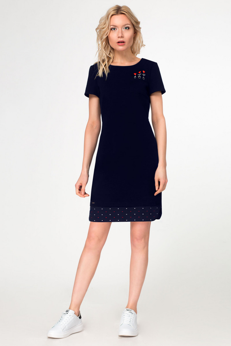 Стильное молодежное платье, которое выполнено на сочетании двух тканей: передняя часть - трикотаж, спинка - текстиль с рисунком. За счет трикотажного переда платье удобное и отлично садится по фигуре. Платье полуприлегающего силуэта, с короткими рукавами. По спинке имеется кокетка, от кокетки вниз имитация застежки с пуговицами. По переду платье дополняет карман с оригинальным декором. Отличный вариант для отдыха.