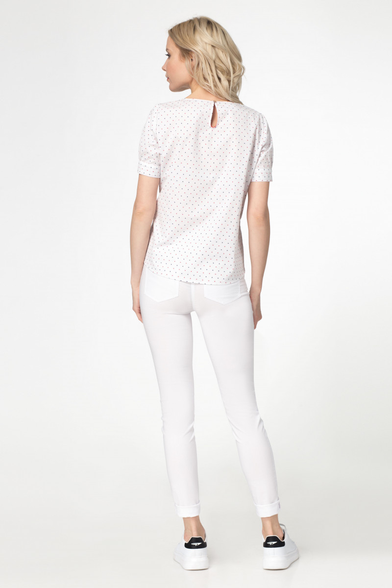 Молодежная блузка из хлопковой ткани с ярким рисунком горошки. Блузка свободного кроя, с короткими рукавами. Рукава на притачной по низу манжете с небольшой сборкой по шву притачивания. По переду вытачки. Блузка дополнена завязками по переду и пришивным декором по груди. Такая блузка отлично сочетается с джинсами, создавая стильный молодежный образ.
