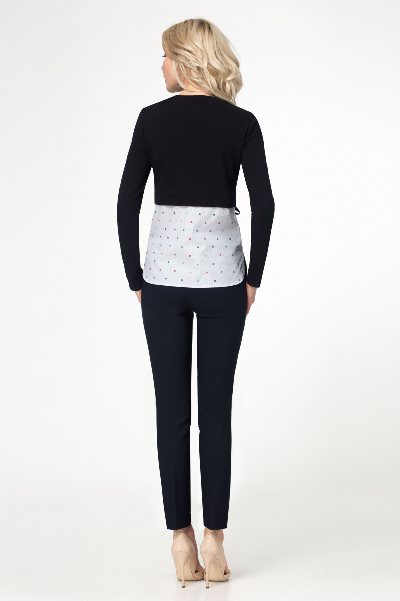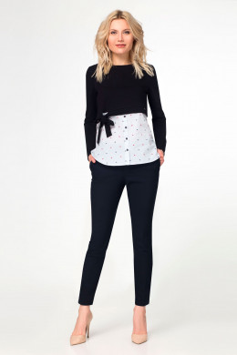 Повседневный джемпер, который выполнен на сочетании двух тканей, трикотажного полотна и тонкого рубашечного хлопка. Джемпер полуприлегающего силуэта, с длинными рукавами, с круглым вырезом горловины. По переду декоративный бант. Отличный вариант в сочетании с любимыми джинсами на каждый день.