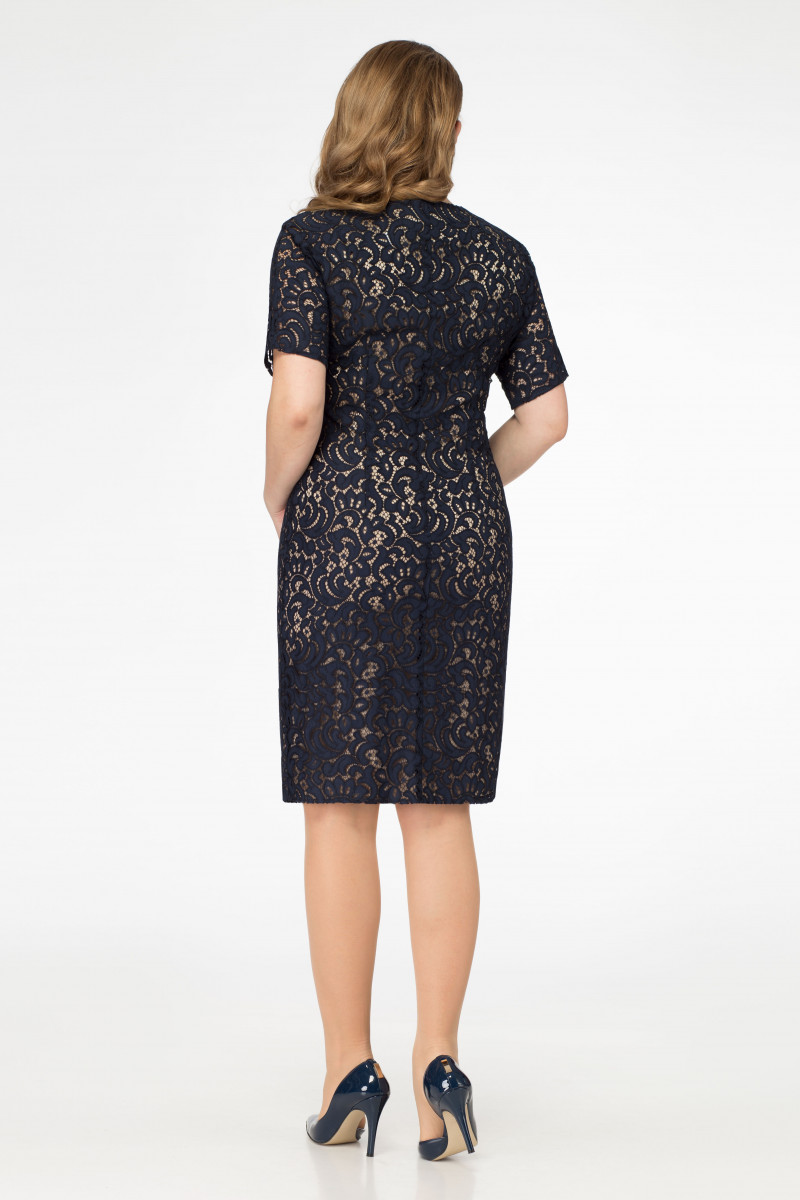 Следуя классическим канонам, не усложняя фасон платья и делая упор на сочетание кружевной ткани и женственный силуэт. Платье полуприлегающего силуэта, длиной до линии коленей. Деталь переда с круглым вырезом горловины, с талиевами вытачками, обеспечивающие отличную посадку по фигуре, рукава цельнокраеные со спущеной линией плеча. В комплект входит съемная брошь на булавке в виде цветка.