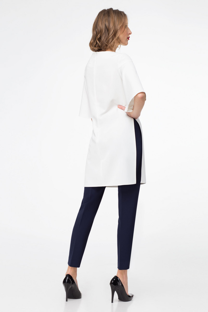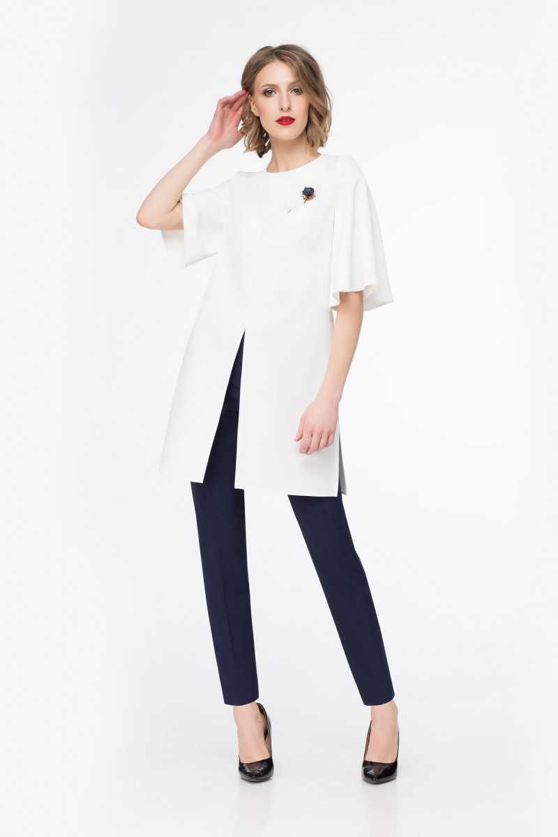 Нарядный брючный костюм, который состоит из удлиненной туники и классических брюк. Туника полуприлегающего силуэта, с глубокими разрезами по бокам и по переду. Туника дополнена шикарными объёмными рукавами и декоративной съёмной брошкой. Брюки классические, на талии, с карманами по переду. Такой костюм отлично подойдет для торжественных мероприятий.