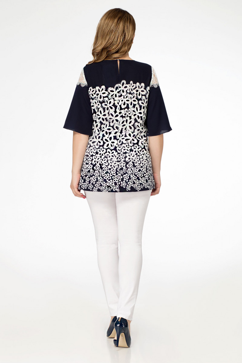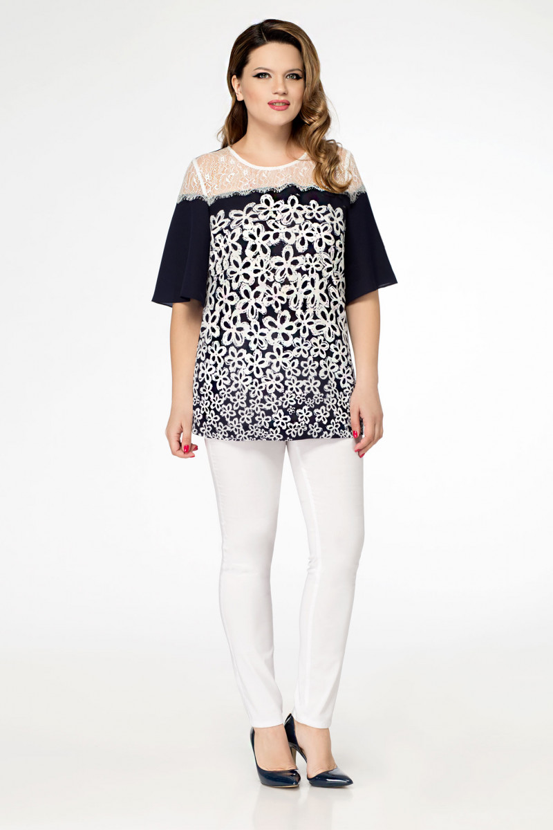 Нарядная туника из шифоновой ткани с отделкой из тонкого французского кружева. Туника полуприлегающего силуэта, с нагрудными вытачками по переду, с кокеткой. Спинка со средним швом. Рукава короткие до локтя, расклешенные. Такая туника отлично сочетается с классическими брюками, создавая нарядный летний образ.