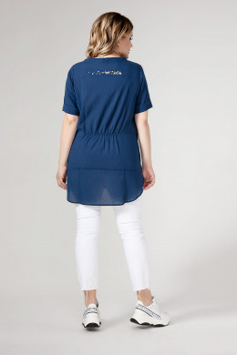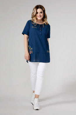 Стильная туника из хлопка, декорированна вышивкой, акцент сделан на романтизм, что делает образ воздушным и загадочным, туника создана для девушек, которые умеют совмещать работу и отдых. Детали переда с круглым вырезом горловины со шнуром из основной ткани, с планкой на петли пуговицы, по линии талии горизонтально расположена резинка, линия низа отрезная фигурной формы от нее располагаются боковые накладные карманы, декорированные вышивкой. Спинка с кокеткой и декорованной вышивкой от нее и резинкой по линии талии.