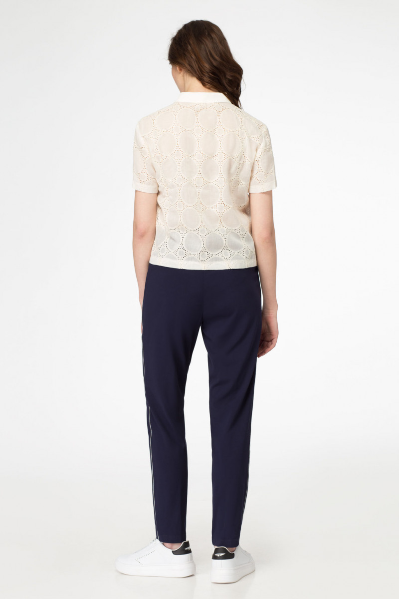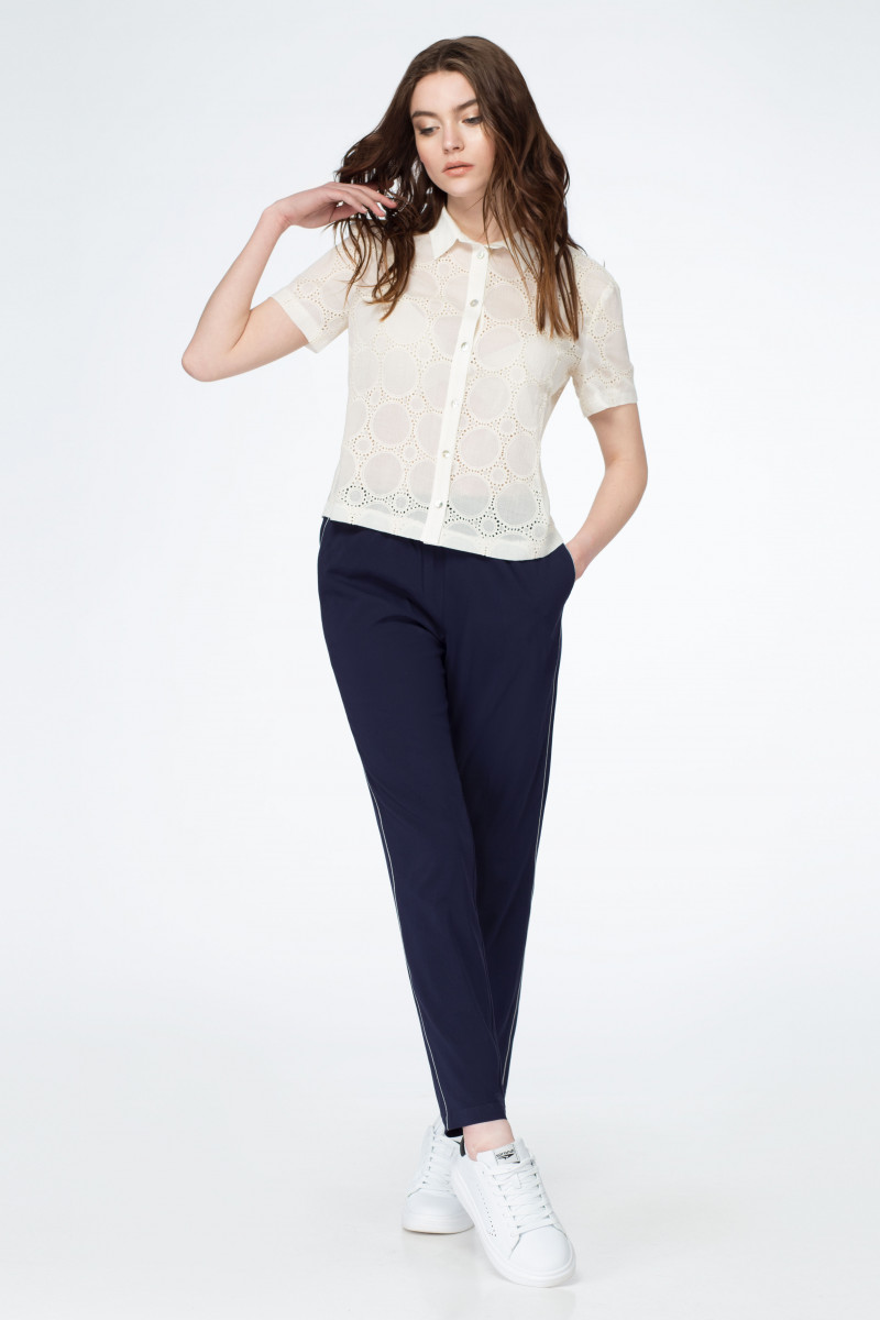 Блузка из вискозной ткани. Прямого силуэта. Длина немного ниже линии талии. С отложным воротником на отрезной стойке. Рукав короткий. С застежкой по переду по планке на петли - пуговицы. Для удобства при движении по спинке введена небольшая сборка по горловине.