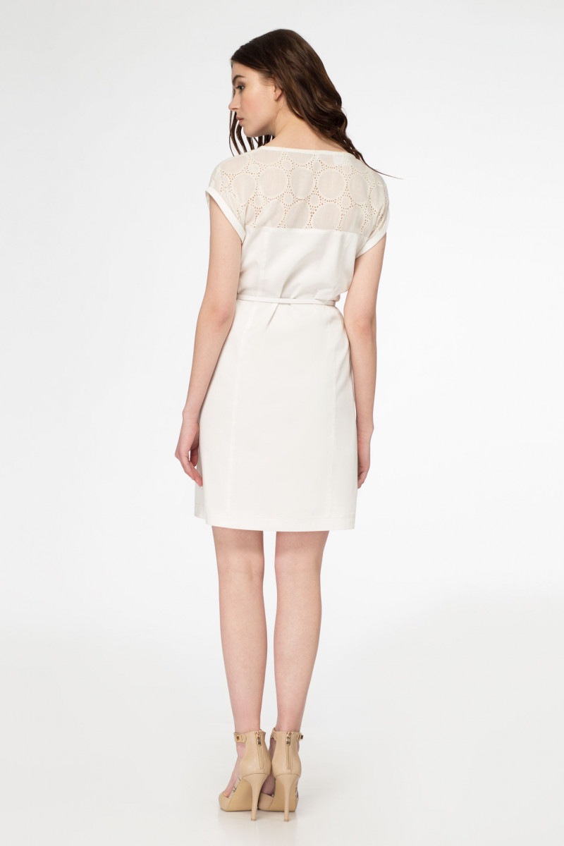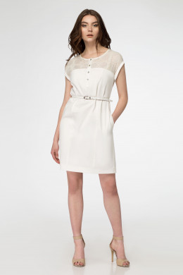 Платье из хлопковой ткани. Прямого силуэта. С кокеткой по переду и спинке. Вырез горловины овальный. Рукав короткий, цельнокроеный, с отрезной отложной манжетой. По переду планка с застежкой на петли-пуговицы. В боковых швах карманы. По нижнему срезу широкая планка. Платье дополняется съемным поясом.