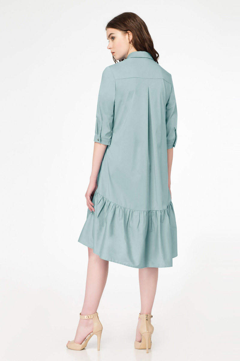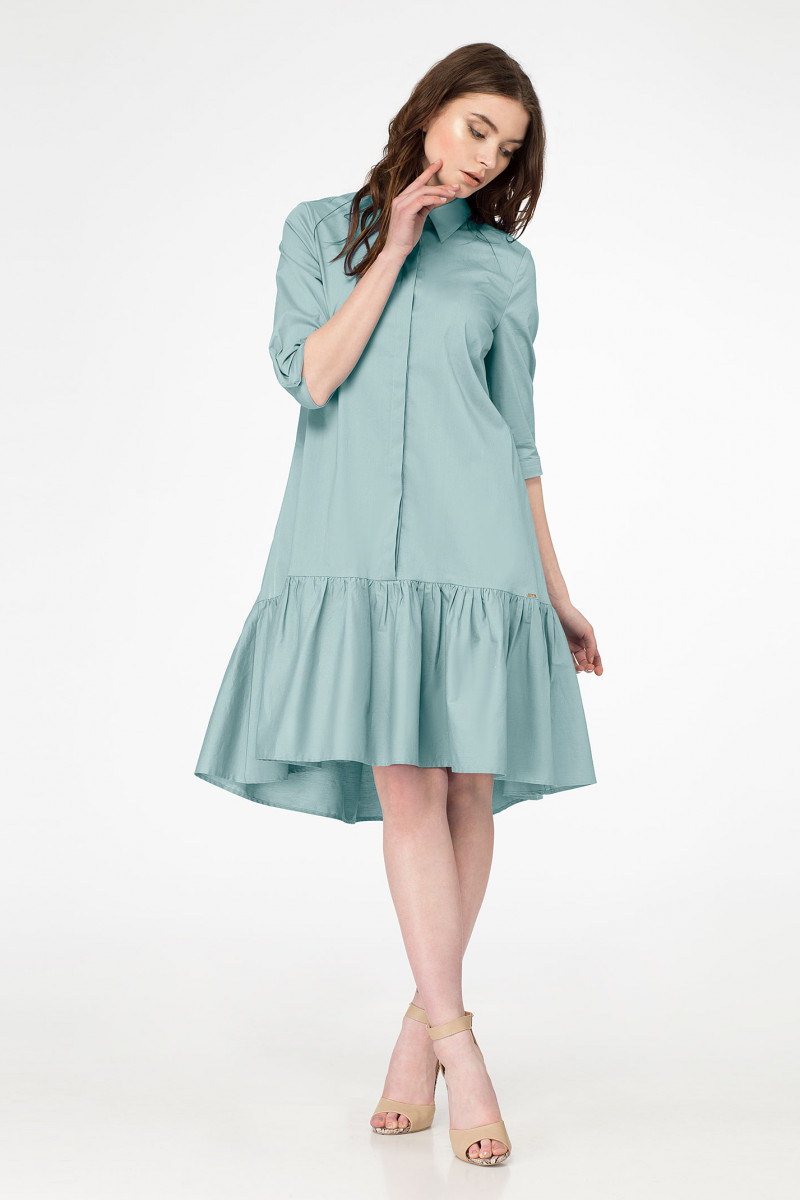 Стильное молодежное платье из хлопковой ткани. Платье создано для уверенной в себе девушки, которая знает, как выглядеть неотразимо. Платье свободного силуэта, с удлиненной спинкой, с большим воланом по низу. Платье с центральной застежкой на потайные петли и пуговицы, с сорочечным воротником. В боковых швах платья имеются карманы. Рукава втачные, с притачными манжетами, застегивающимися на петлю и пуговицу.