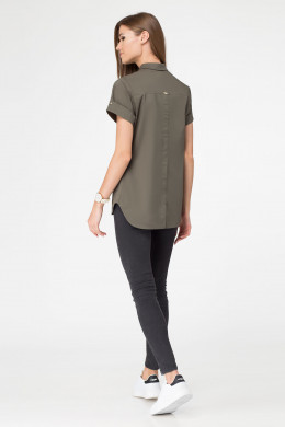 Стильная блузка из хлопковой ткани с яркой вышивкой пайетками на верхней левой части. Блузка полуприлегающего силуэта, с короткими рукавами, с центральной застежкой на потайные петли и пуговицы, с нагрудным карманом на левой части переда. Спинка с кокеткой и небольшим разрезом. Такая рубашка в стиле "милитари" отлично сочетается с джинсами, создавая модный повседневный образ.