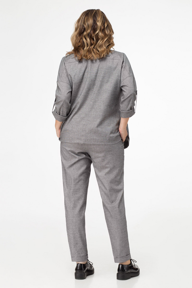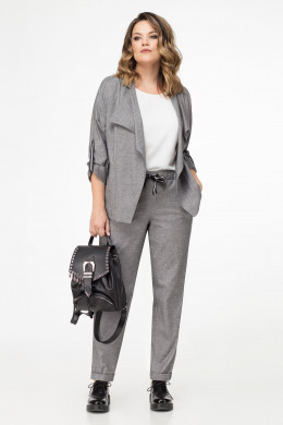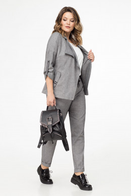 Стильный костюм, в стиле спорт шик из поливискозной ткани. Жакет свободного силуэта, длиной до линии бедер, со спушенной линией плеча. Детали переда с кокеткой, с нагрудной вытачкой и воротником плавно спускающимся. На боковых частях переда расположены боковые карманы с клапанами. Спинка с шрифтовой вышивкой и средним швом. Рукава втачные с декоративными патами в полоску, придавая образу изюминку. Брюки с поясом на резинке и декоративным шнуром в полоску, по переду брюк карманы, слегка заужены к низу.