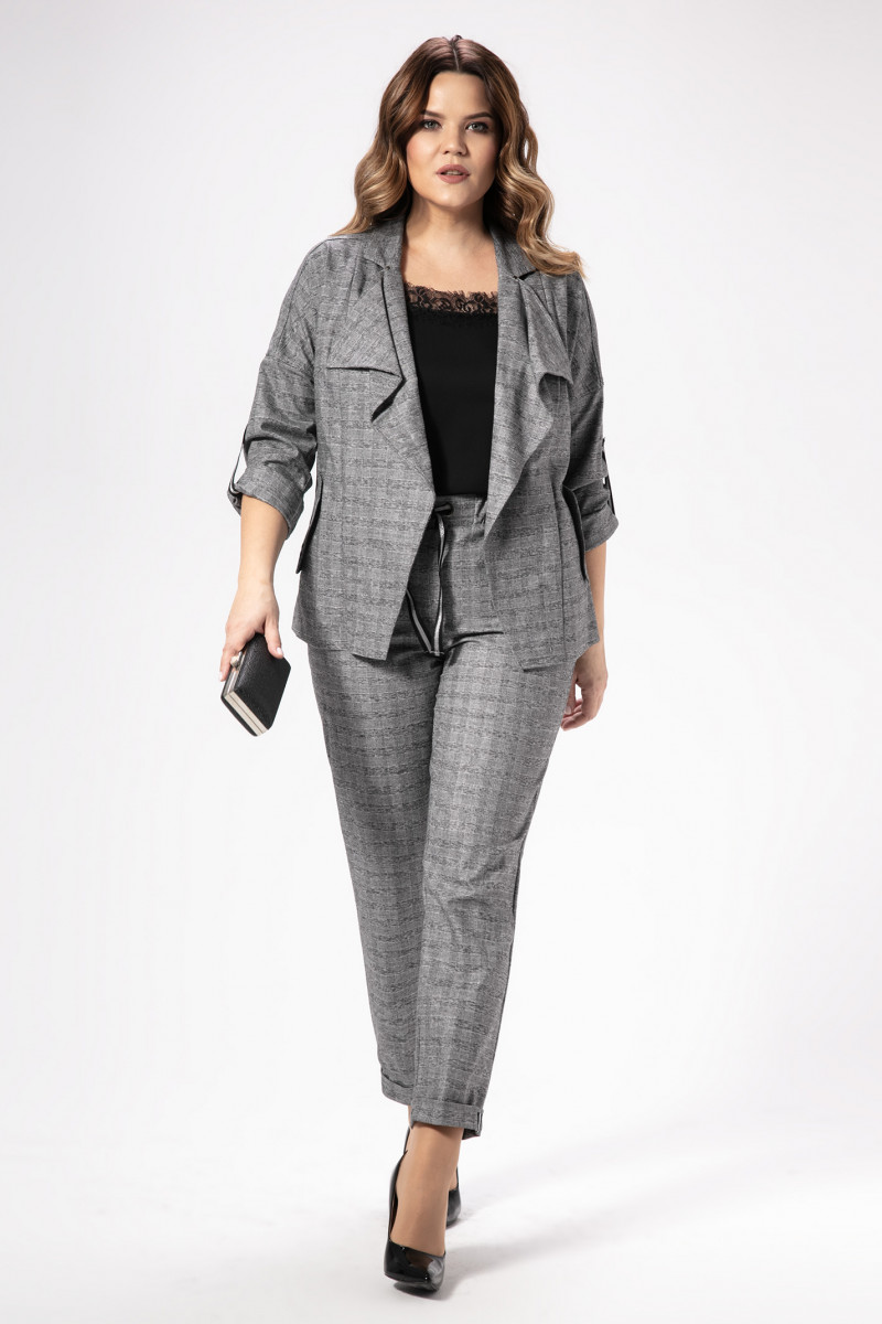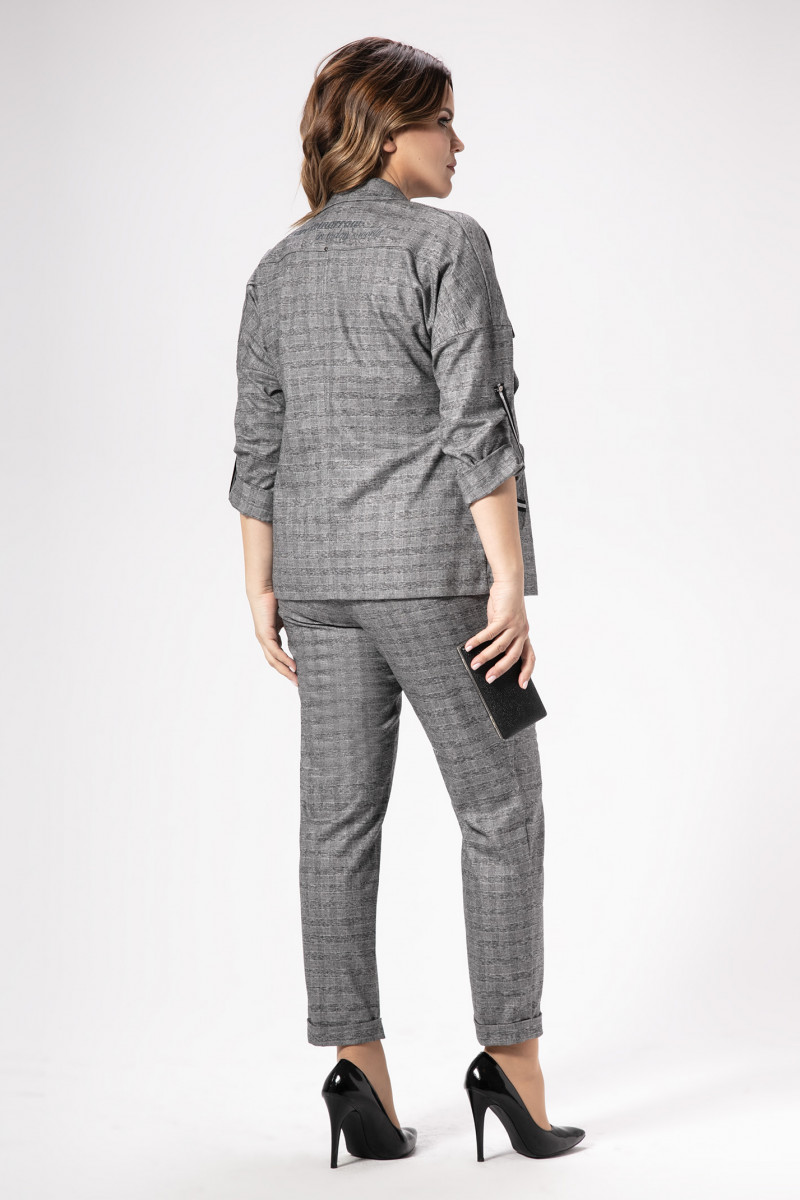 Стильный костюм, в стиле спорт шик из поливискозной ткани. Жакет свободного силуэта, длиной до линии бедер, со спушенной линией плеча. Детали переда с кокеткой, с нагрудной вытачкой и воротником плавно спускающимся. На боковых частях переда расположены боковые карманы с клапанами. Спинка с шрифтовой вышивкой и средним швом. Рукава втачные с декоративными патами в полоску, придавая образу изюминку. Брюки с поясом на резинке и декоративным шнуром в полоску, по переду брюк карманы, слегка заужены к низу.
