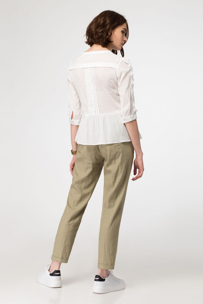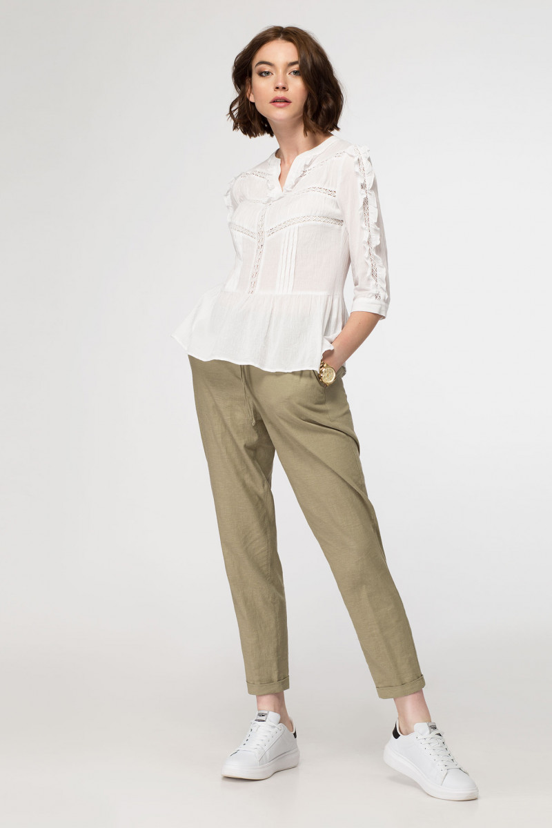 Блузка выполнена из тонкой хлопковой ткани в сочетании с хлопковой кружевной тесьмой. Блузка полуприлегающего силуэта, отрезная по талии, нижняя часть со сборкой. Блузка с фигурным вырезом горловины, с втачными рукавами на манжете. По центру рукава идет хлопковая тесьма с рюшами. По переду блузка декорирована подрезами с хлопковой тесьмой и вертикальными складочками. По спинки кокетка и складки, идущие от кокетки до подреза по талии. Такая легкая блузка отлично подойдет как в офис с классической юбкой, так и с любимыми джинсами для отдыха.