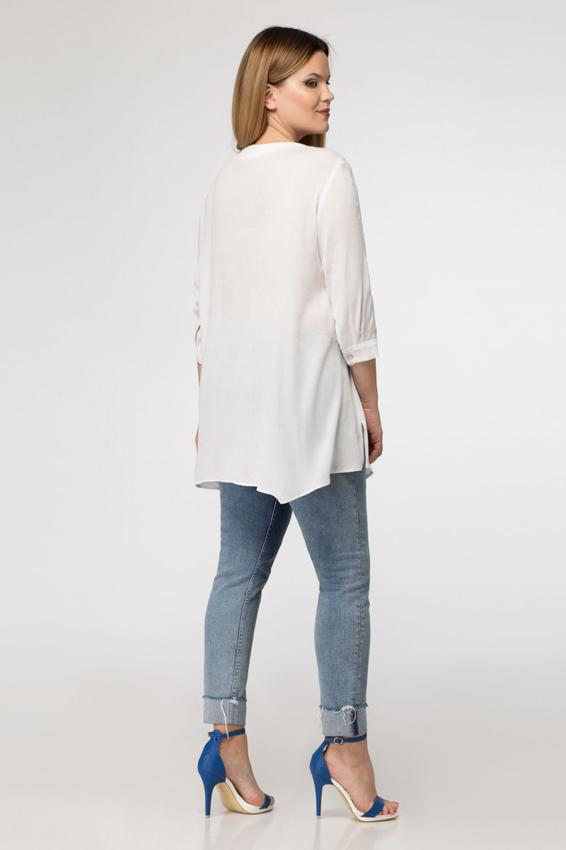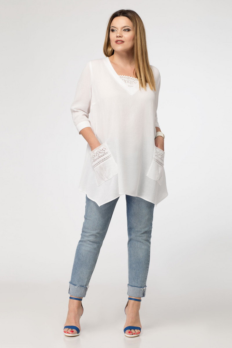 Легкая летняя блузка с изящным хлопковым кружевом. Блузка свободного кроя, расширенная к низу, с разрезами по бокам. Блузка с V-образным вырезом горловины, которая декорирована кружевом.По переду нагрудные вытачки и большие карманы с кружевом. Рукава втачные с притачной манжетой по низу. По центру рукава настрочена кружевная тесьма. Легкая воздушная блузка идеальный вариант для летнего отдыха.